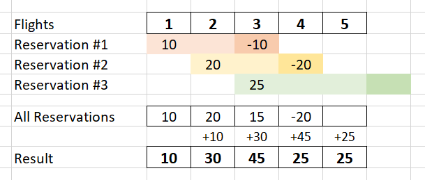 Hence, answer = [10,55,45,25,25]Input: bookings = [[1,2,10],[2,2,15]], n = 2