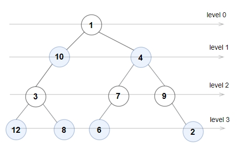 0, its children are at level index1, their children are at level index2, etc.For every even-indexed level, all nodes at the level have odd integer values in strictly increasing order (from left to right).