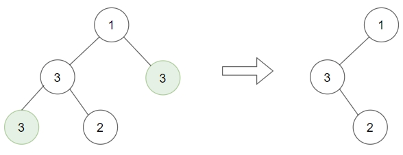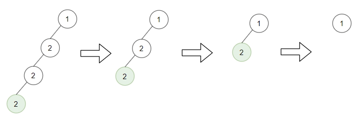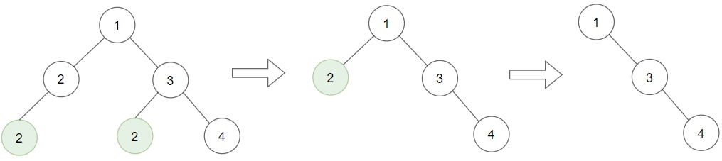 Explanation: Leaf nodes in green with value (target = 2) are removed (Picture in left).