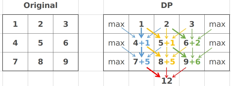 dp[i][j] = min(dp[i][j] + dp[i - 1][j], min(dp[i][j] + dp[i - 1][j - 1], dp[i][j] + dp[i - 1][j + 1]));