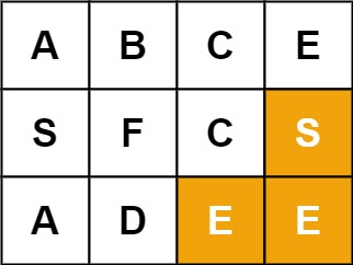 Output: trueInput: board = [["A","B","C","E"],["S","F","C","S"],["A","D","E","E"]], word = "SEE"