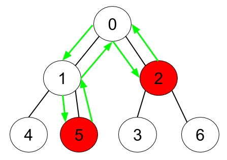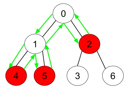Explanation: The figure above represents the given tree where red vertices have an apple. One optimal path to collect all apples is shown by the green arrows. Example 2:
