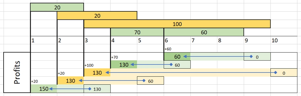 For each time point, we can store the maximum profit we can get starting from that time. We can calculate the maximum profit for the start time using the max profits for the job's end time.