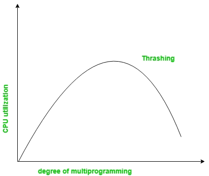 The basic concept involved is that if a process is allocated too few frames, then there will be too many and too frequent page faults. As a result, no useful work would be done by the CPU and the CPU utilisation would fall drastically. The long-term scheduler would then try to improve the CPU utilisation by loading some more processes into the memory thereby increasing the degree of multiprogramming. This would result in a further decrease in the CPU utilization triggering a chained reaction of higher page faults followed by an increase in the degree of multiprogramming, called Thrashing.