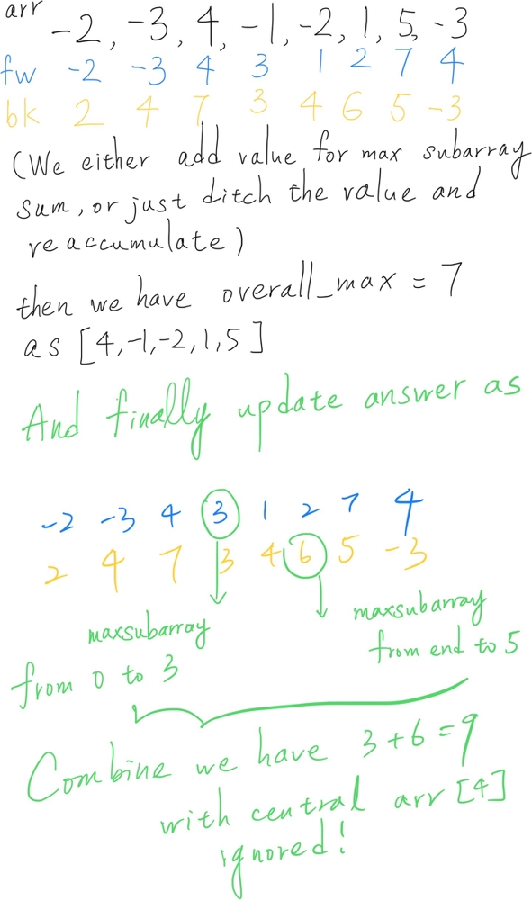 Getting current maximum and updation is same as Kadane’s algorithm. Now when both arrays are created, we can use them for one element removal conditions as follows, at each index i, maximum subarray sum after ignoring i’th element will be fw[i-1] + bw[i+1]
